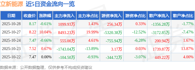 证券之星消息,截至2025年10月28日收盘,立新能源(001258)报收于8.17元,下跌0.61%,换手率9.96%,成交量92.92万手,成交额7.68亿元。
