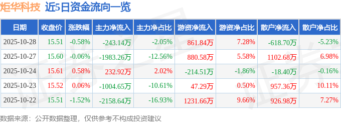 证券之星消息,截至2025年10月28日收盘,炬华科技(300360)报收于15.51元,下跌0.58%,换手率1.52%,成交量7.62万手,成交额1.18亿元。