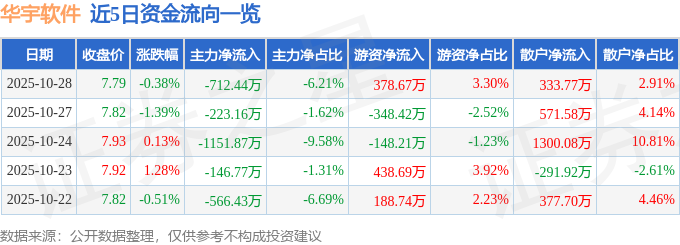 证券之星消息,截至2025年10月28日收盘,华宇软件(300271)报收于7.79元,下跌0.38%,换手率1.84%,成交量14.67万手,成交额1.15亿元。