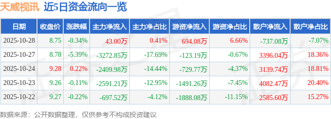 证券之星消息,截至2025年10月28日收盘,天威视讯(002238)报收于8.75元,下跌0.34%,换手率1.48%,成交量11.91万手,成交额1.04亿元。