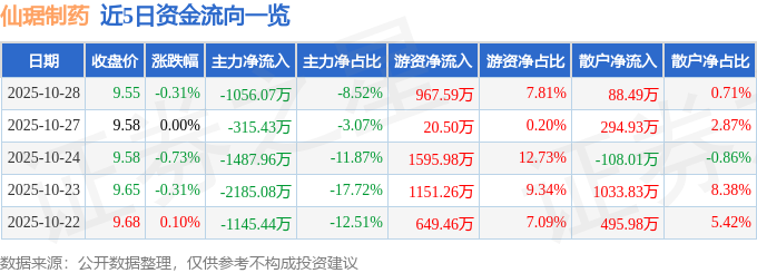 证券之星消息,截至2025年10月28日收盘,仙琚制药(002332)报收于9.55元,下跌0.31%,换手率1.32%,成交量13.01万手,成交额1.24亿元。