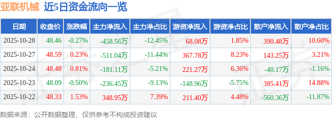 10月28日的资金流向数据方面,主力资金净流出458.56万元,占总成交额12.45%,游资资金净流入68.08万元,占总成交额1.85%,散户资金净流入390.48万元,占总成交额10.6%。