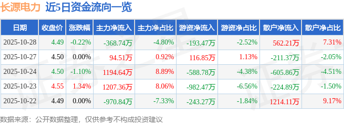 证券之星消息,截至2025年10月28日收盘,长源电力(000966)报收于4.49元,下跌0.22%,换手率0.52%,成交量17.08万手,成交额7685.75万元。
