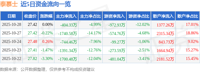 10月28日的资金流向数据方面,主力资金净流出404.33万元,占总成交额4.99%,游资资金净流出972.93万元,占总成交额12.02%,散户资金净流入1377.26万元,占总成交额17.01%。
