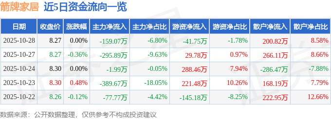 证券之星消息,截至2025年10月28日收盘,箭牌家居(001322)报收于8.27元,上涨0.0%,换手率0.36%,成交量2.81万手,成交额2339.91万元。