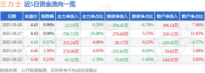 证券之星消息,截至2025年10月28日收盘,三 力 士(002224)报收于4.43元,上涨0.0%,换手率1.21%,成交量9.78万手,成交额4345.0万元。