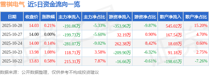 证券之星消息,截至2025年10月28日收盘,雪祺电气(001387)报收于14.03元,上涨0.21%,换手率2.24%,成交量2.55万手,成交额3585.62万元。