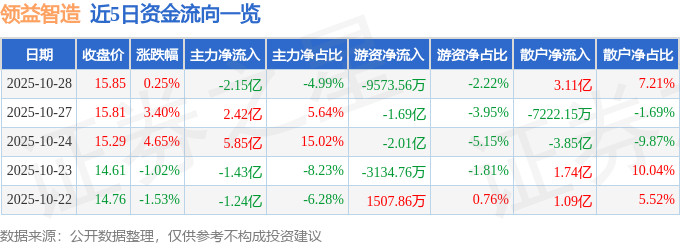 证券之星消息,截至2025年10月28日收盘,领益智造(002600)报收于15.85元,上涨0.25%,换手率3.77%,成交量271.05万手,成交额43.11亿元。