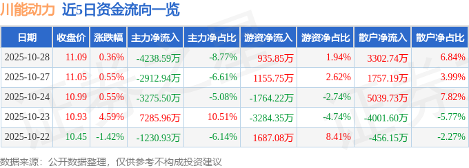 证券之星消息,截至2025年10月28日收盘,川能动力(000155)报收于11.09元,上涨0.36%,换手率2.35%,成交量43.32万手,成交额4.83亿元。