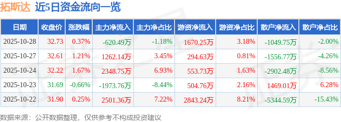 证券之星消息,截至2025年10月28日收盘,拓斯达(300607)报收于32.73元,上涨0.37%,换手率4.8%,成交量15.94万手,成交额5.26亿元。