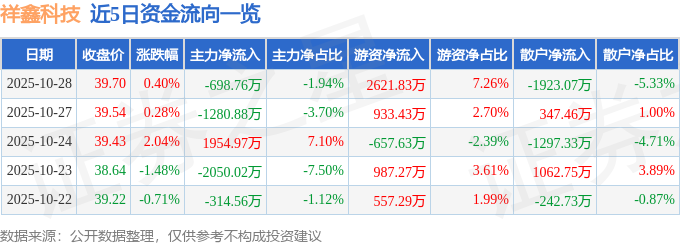 证券之星消息,截至2025年10月28日收盘,祥鑫科技(002965)报收于39.7元,上涨0.4%,换手率4.56%,成交量9.08万手,成交额3.61亿元。