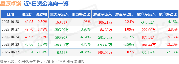 证券之星消息,截至2025年10月28日收盘,星源卓镁(301398)报收于49.95元,上涨0.5%,换手率4.99%,成交量1.67万手,成交额8326.08万元。
