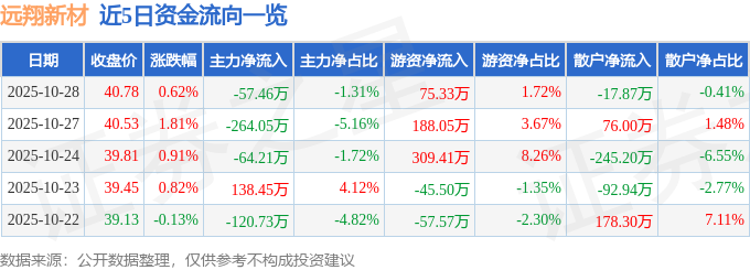 证券之星消息,截至2025年10月28日收盘,远翔新材(301300)报收于40.78元,上涨0.62%,换手率3.47%,成交量1.07万手,成交额4384.83万元。