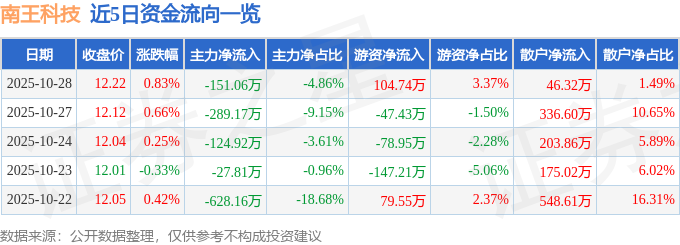 证券之星消息,截至2025年10月28日收盘,南王科技(301355)报收于12.22元,上涨0.83%,换手率2.54%,成交量2.55万手,成交额3106.26万元。