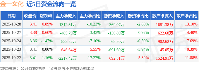 证券之星消息,截至2025年10月28日收盘,金一文化(002721)报收于3.41元,上涨0.89%,换手率1.42%,成交量37.73万手,成交额1.28亿元。