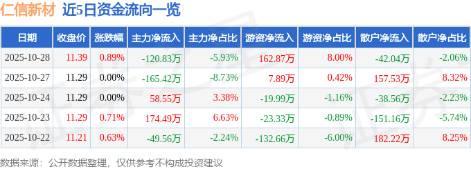 证券之星消息,截至2025年10月28日收盘,仁信新材(301395)报收于11.39元,上涨0.89%,换手率1.39%,成交量1.79万手,成交额2037.12万元。