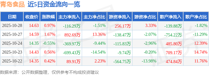 证券之星消息,截至2025年10月28日收盘,青岛食品(001219)报收于14.63元,上涨0.97%,换手率2.77%,成交量5.26万手,成交额7683.27万元。