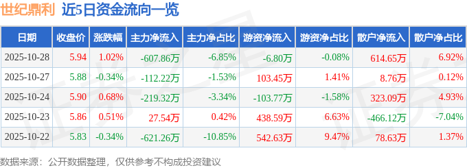证券之星消息,截至2025年10月28日收盘,世纪鼎利(300050)报收于5.94元,上涨1.02%,换手率2.75%,成交量15.0万手,成交额8879.64万元。