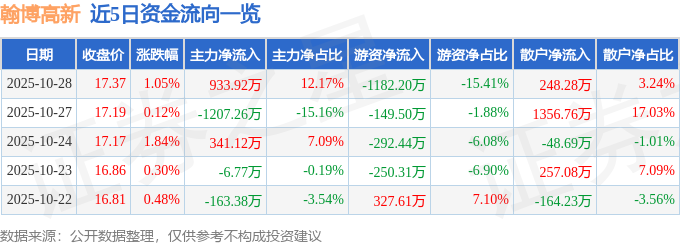 证券之星消息,截至2025年10月28日收盘,翰博高新(301321)报收于17.37元,上涨1.05%,换手率3.0%,成交量4.43万手,成交额7672.29万元。