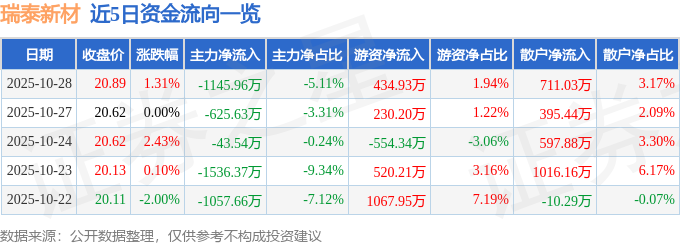 证券之星消息,截至2025年10月28日收盘,瑞泰新材(301238)报收于20.89元,上涨1.31%,换手率1.47%,成交量10.76万手,成交额2.24亿元。