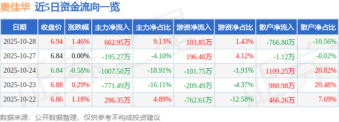 证券之星消息,截至2025年10月28日收盘,奥佳华(002614)报收于6.94元,上涨1.46%,换手率2.38%,成交量10.48万手,成交额7262.19万元。