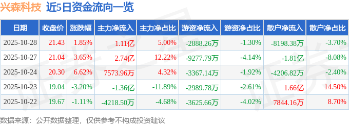 证券之星消息,截至2025年10月28日收盘,兴森科技(002436)报收于21.43元,上涨1.85%,换手率6.84%,成交量103.26万手,成交额22.18亿元。