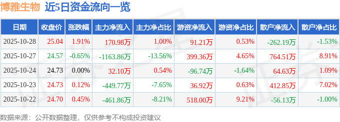 证券之星消息,截至2025年10月28日收盘,博雅生物(300294)报收于25.04元,上涨1.91%,换手率1.36%,成交量6.85万手,成交额1.71亿元。