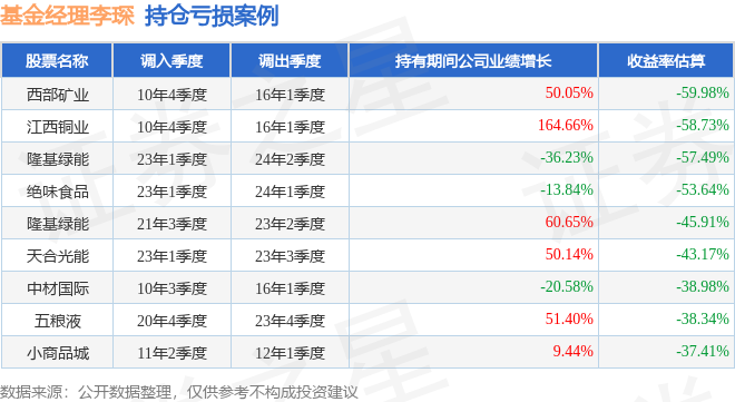 李琛管理的广发大盘成长混合基金在10年4季度买入西部矿业,在持有5年又1个季度后在16年1季度卖出。持有期间的估算收益率为-59.98%,持有期间西部矿业在2010年到2016年的年报营业总收入增幅达50.05%。
