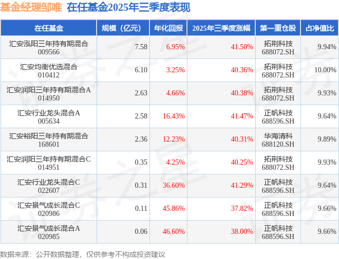 证券之星消息,截止2025年三季度末,基金经理邹唯旗下共管理9只基金,本季度表现最佳的为汇安泓阳三年持有期混合(009566),季度净值涨41.5%。