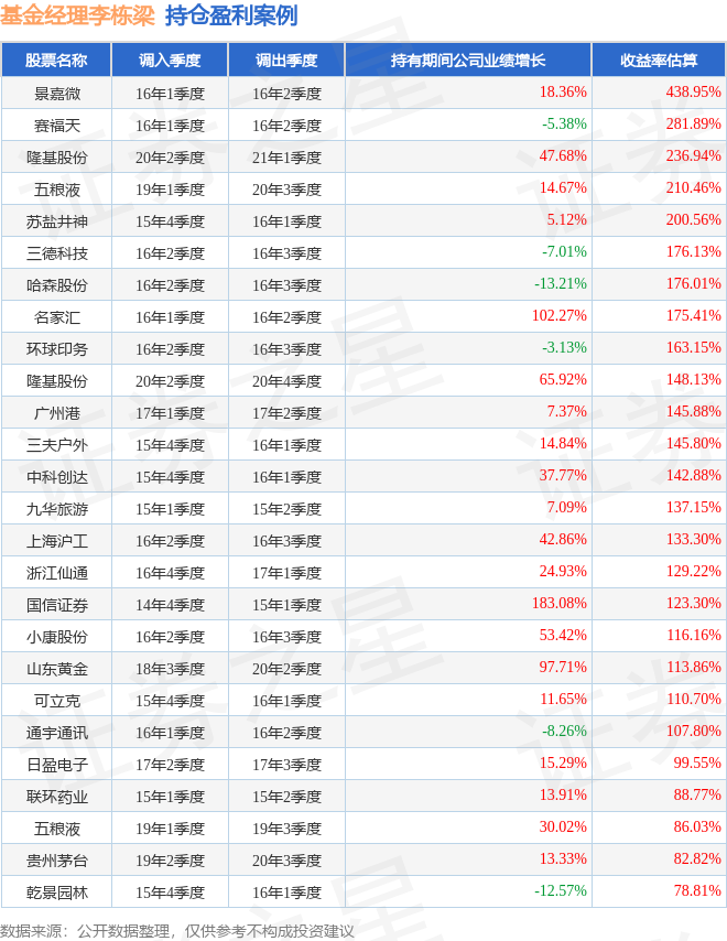 李栋梁管理的华宝新价值混合基金在16年1季度买入景嘉微,在持有1个季度后在16年2季度卖出。持有期间的估算收益率为438.95%,持有期间景嘉微在2015年到2016年的年报归属净利润增幅达18.36%。