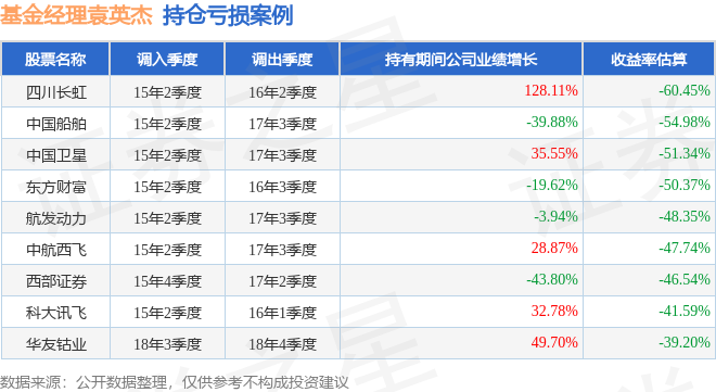 袁英杰管理的申万军工LOF基金在15年2季度买入四川长虹,在持有1年又0个季度后在16年2季度卖出。持有期间的估算收益率为-60.44%,持有期间四川长虹在2015年到2016年的年报归属净利润增幅达128.11%。