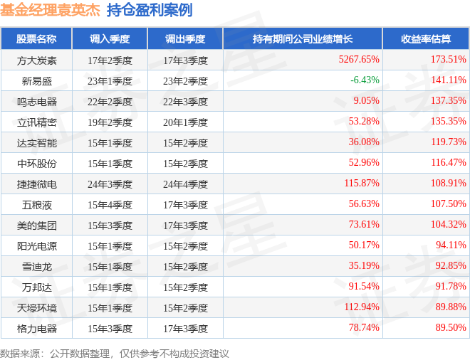 袁英杰管理的申万菱信中证500指数优选增强A基金在17年2季度买入方大炭素,在持有1个季度后在17年3季度卖出。持有期间的估算收益率为173.51%,持有期间方大炭素在2016年到2017年的年报归属净利润增幅达5267.65%。