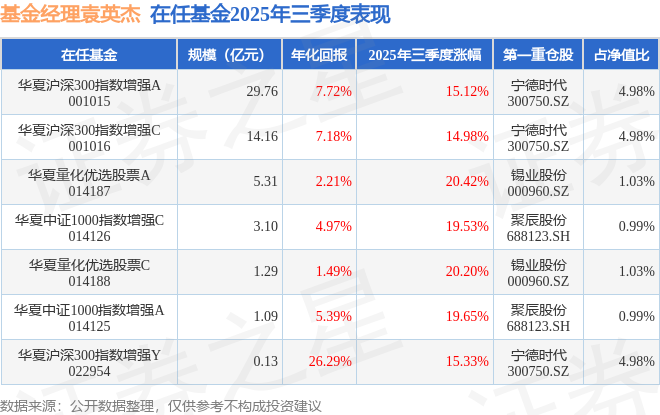 证券之星消息,截止2025年三季度末,基金经理袁英杰旗下共管理7只基金,本季度表现最佳的为华夏量化优选股票A(014187),季度净值涨20.42%。
