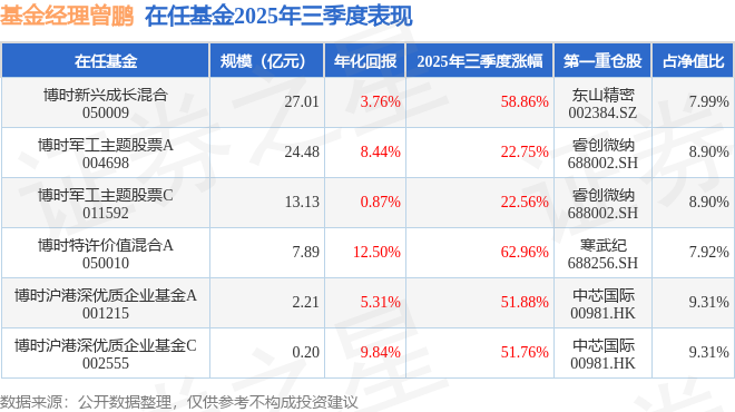 证券之星消息,截止2025年三季度末,基金经理曾鹏旗下共管理6只基金,本季度表现最佳的为博时特许价值混合A(050010),季度净值涨62.96%。