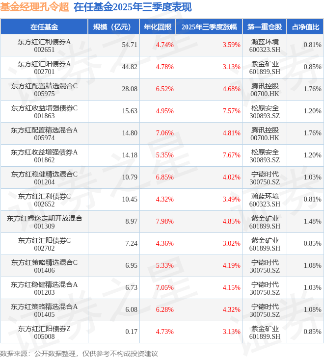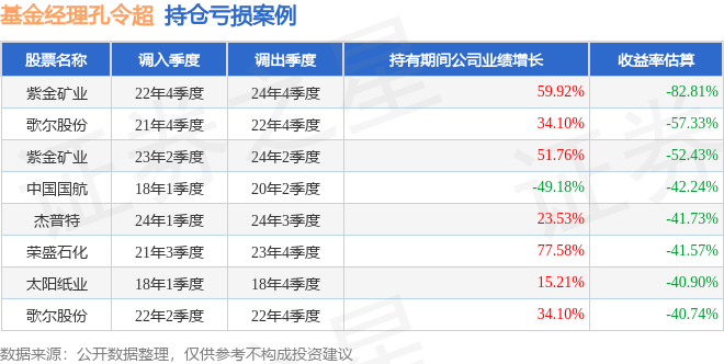 孔令超管理的东方红稳健精选混合A基金在22年4季度买入紫金矿业,在持有2年又0个季度后在24年4季度卖出。持有期间的估算收益率为-82.81%,持有期间紫金矿业在2022年到2024年的年报归属净利润增幅达59.92%。