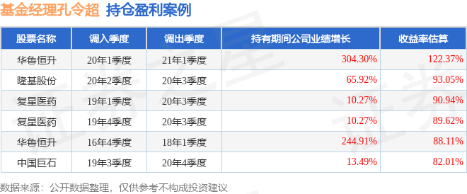 孔令超管理的东方红品质优选定开混合基金在20年1季度买入华鲁恒升,在持有1年又0个季度后在21年1季度卖出。持有期间的估算收益率为122.37%,持有期间华鲁恒升在2020年到2021年的年报归属净利润增幅达304.3%。