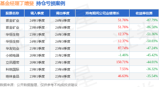丁靖斐管理的华宝远恒混合A基金在24年1季度买入紫金矿业,在持有3个季度后在24年4季度卖出。持有期间的估算收益率为-87.79%,持有期间紫金矿业在2023年到2024年的年报归属净利润增幅达51.76%。