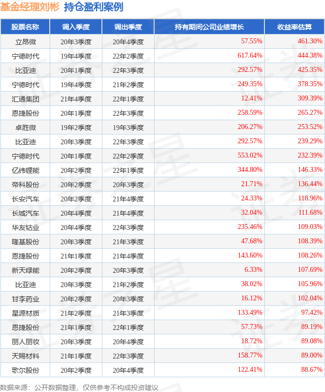刘彬管理的新华安享多裕定开混合基金在20年3季度买入立昂微,在持有1个季度后在20年4季度卖出。持有期间的估算收益率为461.3%,持有期间立昂微在2019年到2020年的年报归属净利润增幅达57.55%。