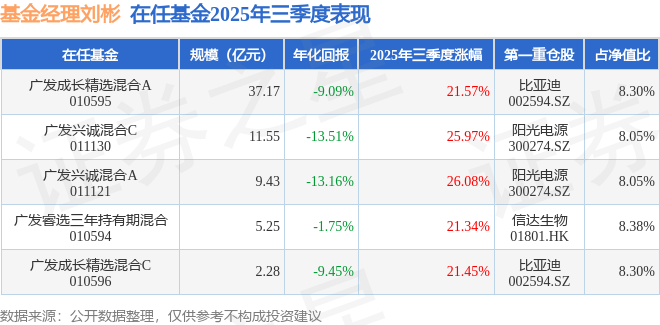 证券之星消息,截止2025年三季度末,基金经理刘彬旗下共管理5只基金,本季度表现最佳的为广发兴诚混合A(011121),季度净值涨26.08%。