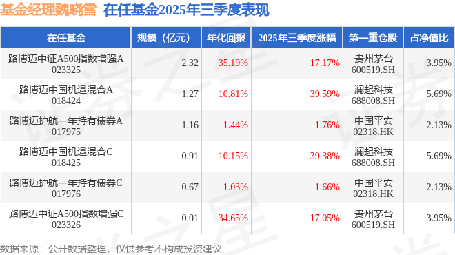 证券之星消息,截止2025年三季度末,基金经理魏晓雪旗下共管理6只基金,本季度表现最佳的为路博迈中国机遇混合A(018424),季度净值涨39.59%。