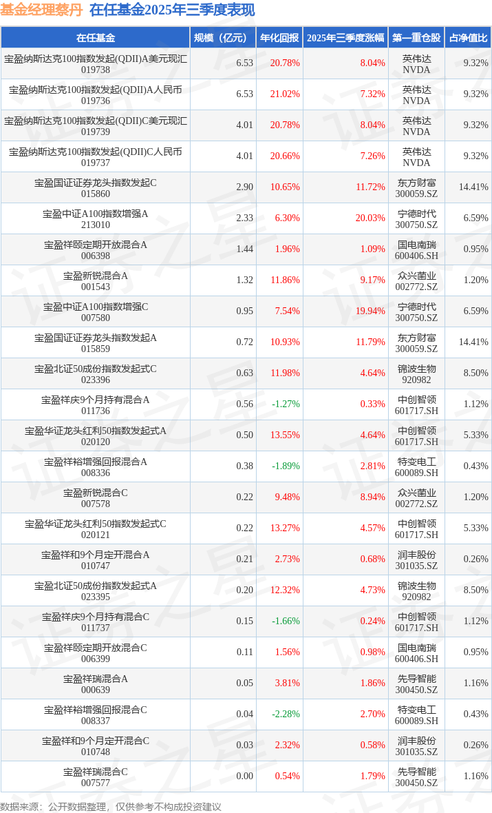 证券之星消息,截止2025年三季度末,基金经理蔡丹旗下共管理24只基金,本季度表现最佳的为宝盈中证A100指数增强A(213010),季度净值涨20.03%。
