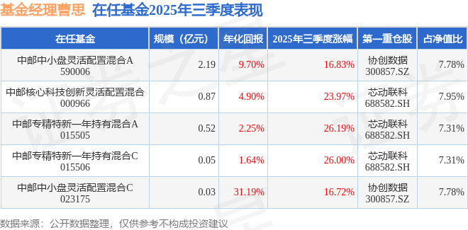 证券之星消息,截止2025年三季度末,基金经理曹思旗下共管理5只基金,本季度表现最佳的为中邮专精特新一年持有混合A(015505),季度净值涨26.19%。