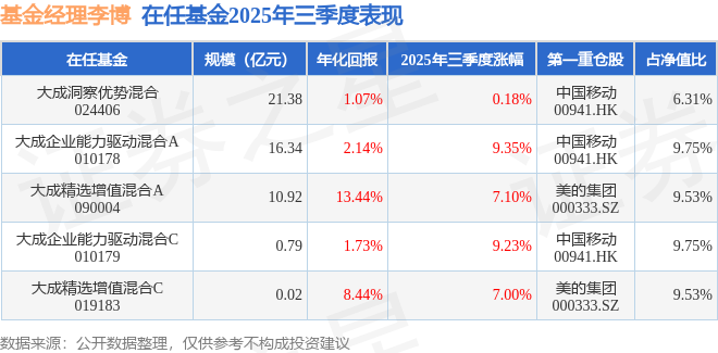 证券之星消息,截止2025年三季度末,基金经理李博旗下共管理5只基金,本季度表现最佳的为大成企业能力驱动混合A(010178),季度净值涨9.35%。