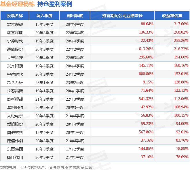杨栋管理的富国清洁能源产业混合A基金在20年2季度买入爱旭股份,在持有2个季度后在20年4季度卖出。持有期间的估算收益率为94%,持有期间爱旭股份在2019年到2020年的年报营业总收入增幅达59.23%。