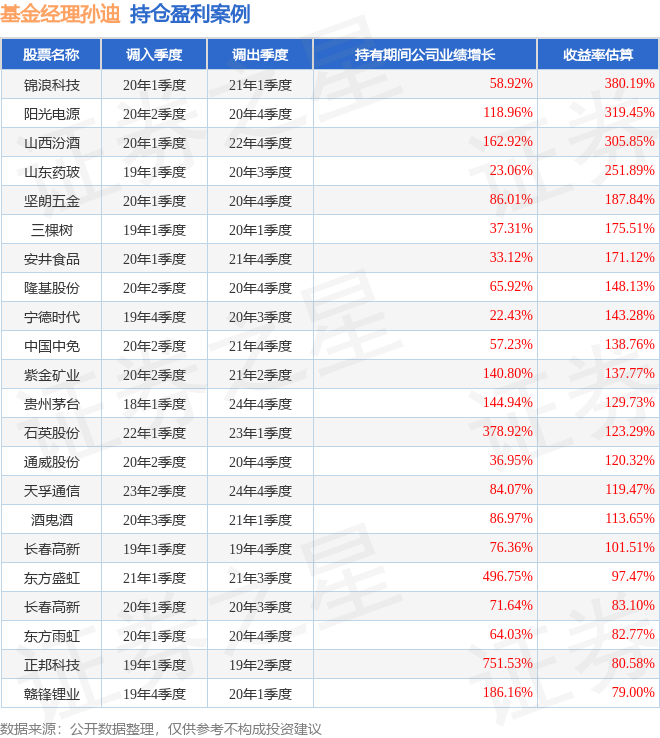 孙迪管理的广发高端制造股票A基金在20年1季度买入锦浪科技,在持有1年又0个季度后在21年1季度卖出。持有期间的估算收益率为380.19%,持有期间锦浪科技在2020年到2021年的年报营业总收入增幅达58.92%。
