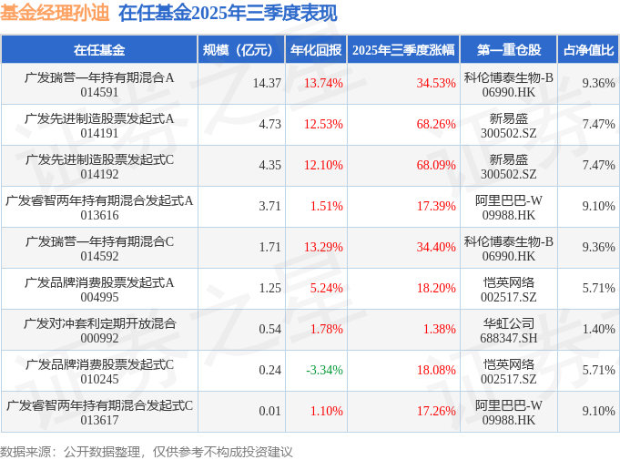 孙迪管理的广发资源优选股票A基金在18年1季度买入华友钴业,在持有3个季度后在18年4季度卖出。持有期间的估算收益率为-52.01%,持有期间华友钴业在2017年到2018年的年报营业总收入增幅达49.7%。