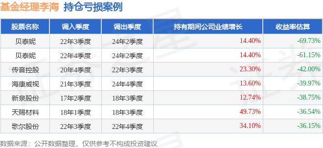 李海管理的国泰消费优选股票基金在22年3季度买入贝泰妮,在持有1年又3个季度后在24年2季度卖出。持有期间的估算收益率为-69.73%,持有期间贝泰妮在2022年到2024年的年报营业总收入增幅达14.4%。
