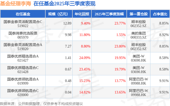 证券之星消息,截止2025年三季度末,基金经理李海旗下共管理7只基金,本季度表现最佳的为国泰金泰灵活配置混合A(519020),季度净值涨23.8%。