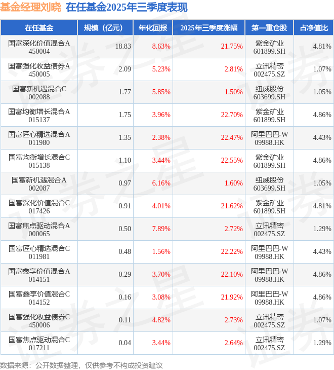 刘晓管理的国富匠心精选混合A基金在23年2季度买入紫金矿业,在持有1年又1个季度后在24年3季度卖出。持有期间的估算收益率为-86.35%,持有期间紫金矿业在2023年到2024年的年报归属净利润增幅达51.76%。