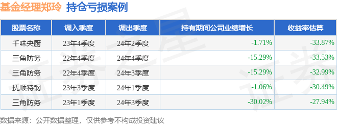 郑玲管理的国联鑫思路混合A基金在23年4季度买入千味央厨,在持有2个季度后在24年2季度卖出。持有期间的估算收益率为-33.87%,持有期间千味央厨在2023年到2024年的年报营业总收入降幅为1.71%。